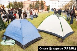 Между тем к моменту, когда протестующие после шествия вернулись на площадь, несколько человек начали расставлять три палатки.